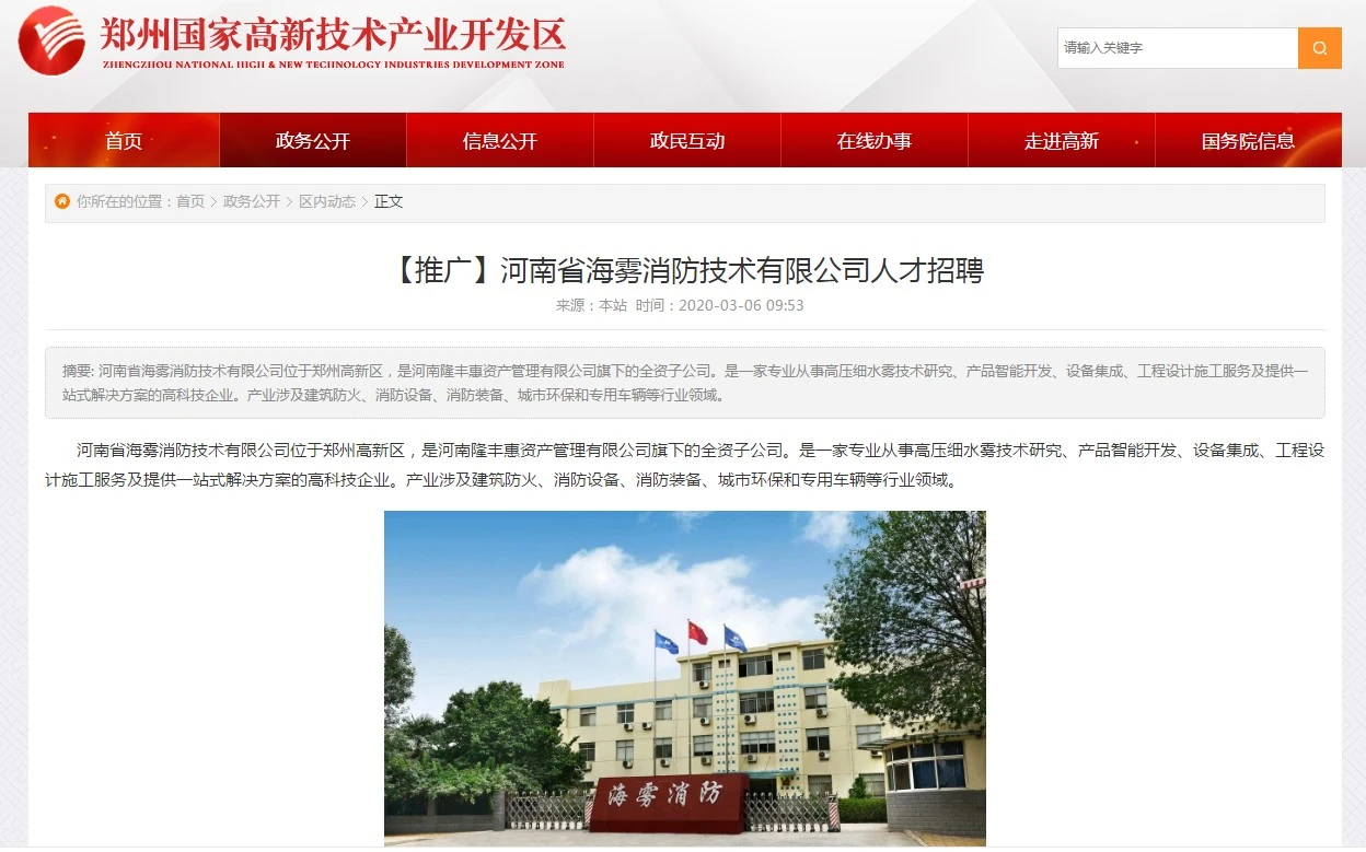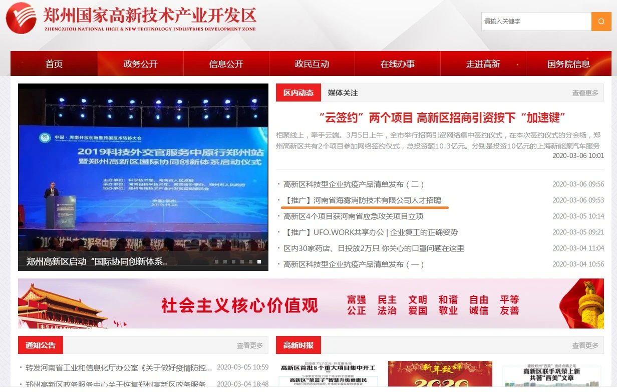 “抗击疫情您贡献,广告宣传我免单”,3月6日高新区管委会网站、郑报高新融媒中心发布河南省海雾消防技术有限公司人才招聘推广广告,助力企业复工复产。