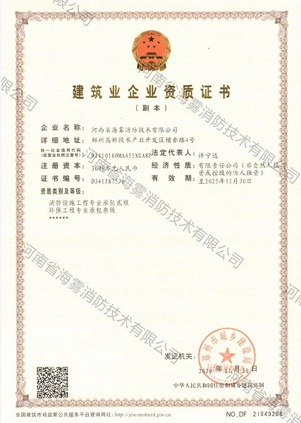 近日,经郑州市城乡建设局审核批准,河南省海雾消防技术有限公司顺利取得消防设施工程专业承包贰级、环保工程专业承包三级资质证书!